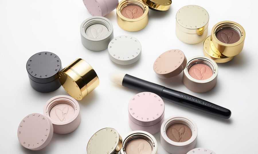 Geöffnete runde Make-up-Dose mit einem pfirsichfarbenen Highlighter, silberner Deckel mit Aufschrift „Westman Atelier“.