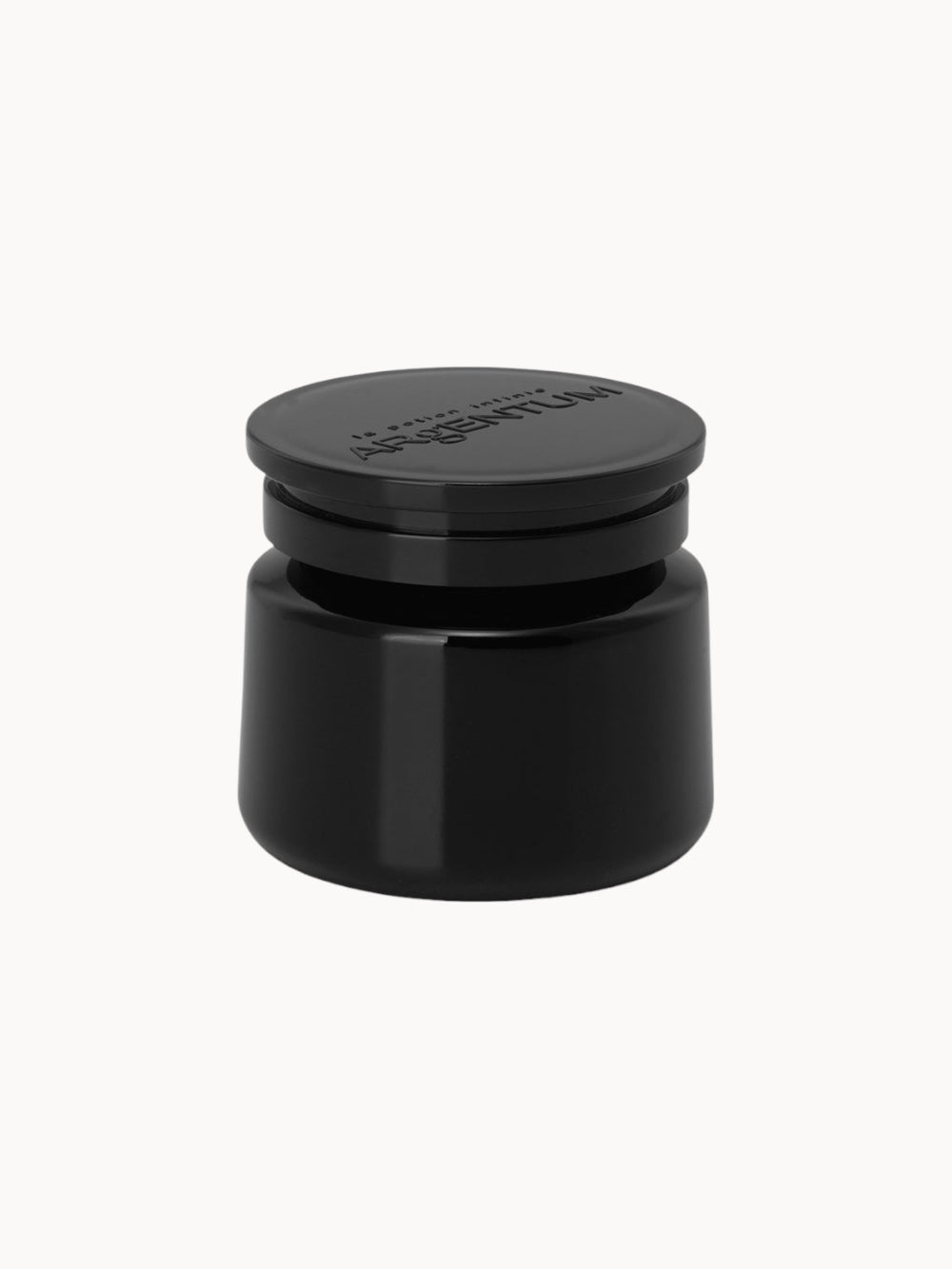 Schwarzer Kosmetiktiegel mit Deckel, Produktname ‚La potion infinie‘ von ARGENTUM sichtbar auf dem Deckel.