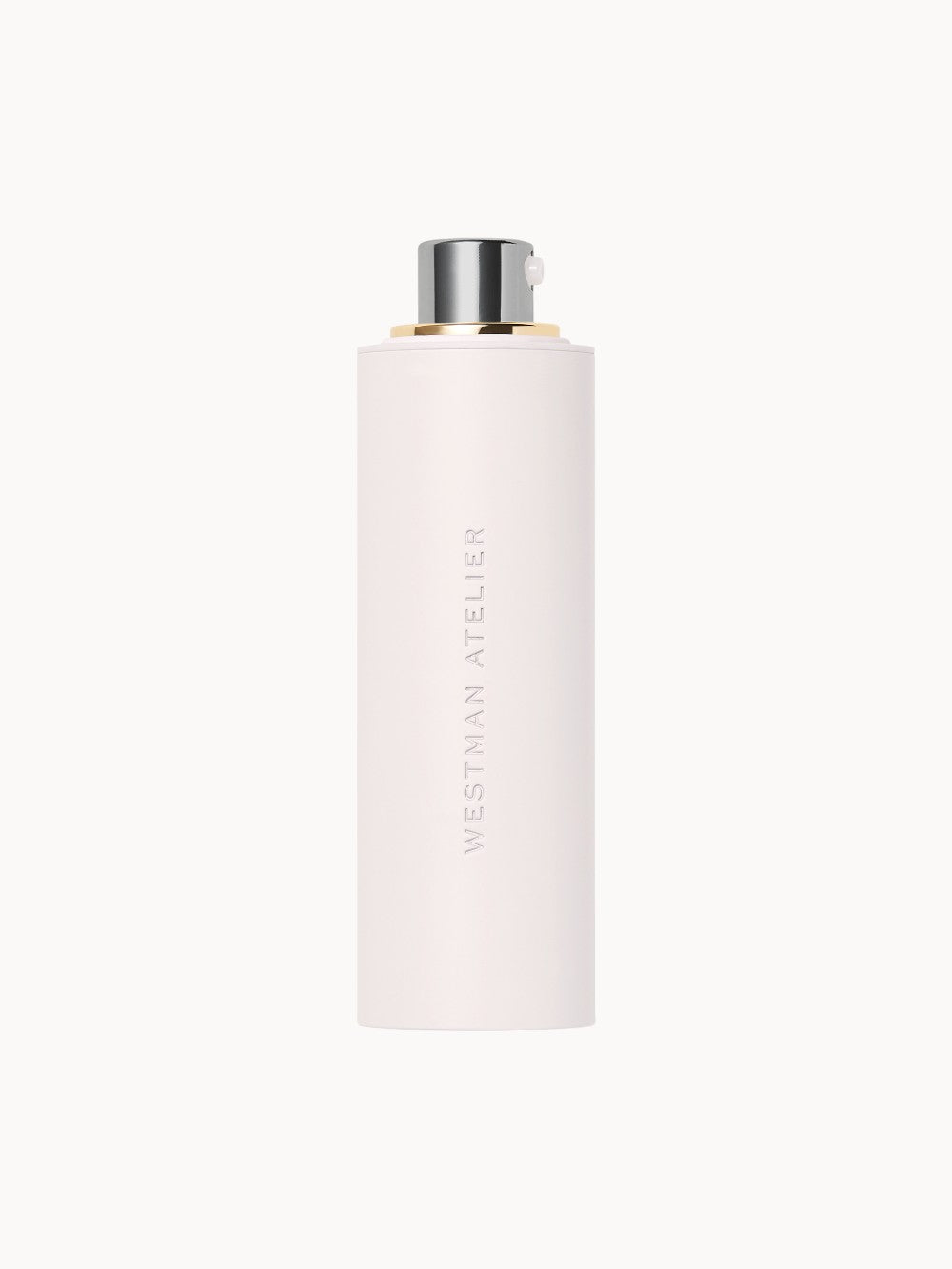 Helles, zylinderförmiges Fläschchen mit Pumpspender und silbernem Deckel, Aufschrift ‚Westman Atelier‘ auf der Vorderseite.